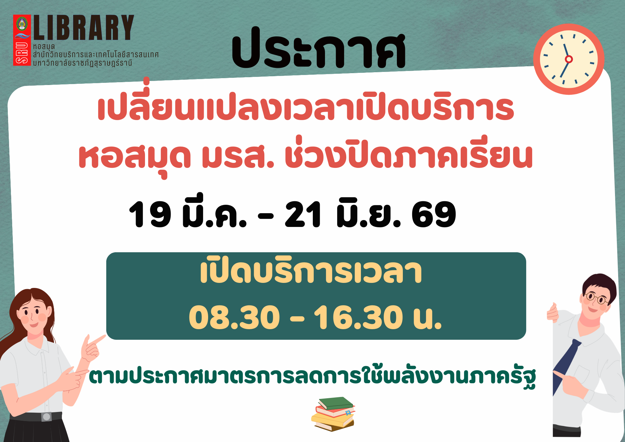 ประกาศ…แจ้งเปลี่ยนแปลงเวลาเปิดทำการอาคารหอสมุดช่วงปิดภาคเรียน ตั้งแต่วันที่ 19 มีนาคม - 21 มิถุนายน 2569::::::::::::::::::::เวลาเปิดทำการ 08.30 - 16.30 น.หยุดวันนักขัตฤกษ์ หรือ ตามประกาศหอสมุด:::::::::::::::::::::ทั้งนี้ เพื่อให้เป็นไปตามประกาศมาตรการลดการใช้พลังงานของหน่วยงานภาครัฐ