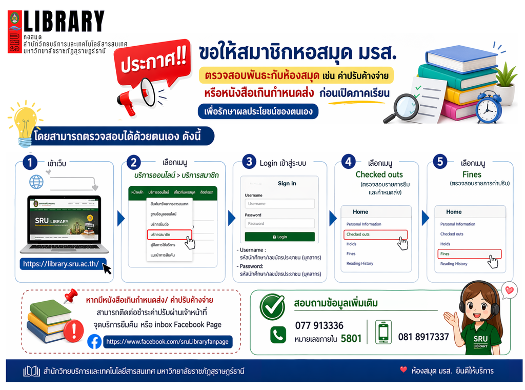 หอสมุด ขอเชิญชวนคณาจารย์ บุคลากร และนักศึกษาทุกท่าน ร่วม ตรวจสอบพันธะกับห้องสมุดด้วยตนเอง ผ่านระบบออนไลน์ ก่อนเปิดภาคเรียน เพื่อเตรียมความพร้อมในการใช้บริการห้องสมุดได้อย่างต่อเนื่อง การตรวจสอบพันธะกับห้องสมุด เช่น รายการหนังสือที่ยืมอยู่ กำหนดส่งคืน หรือค่าปรับค้างจ่าย จะช่วยให้ท่านสามารถบริหารจัดการการใช้บริการได้อย่างมีประสิทธิภาพ…