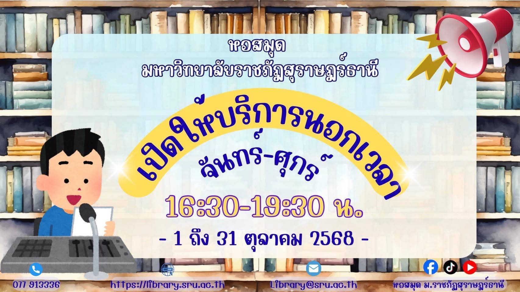 หอสมุด มหาวิทยาลัยราชภัฏสุราษฎร์ธานี เปิดให้บริการนอกเวลาราชการ วันจันทร์ - ศุกร์ เวลา 16.30 - 19.30 น. ตั้งแต่ 1 ถึง 31…